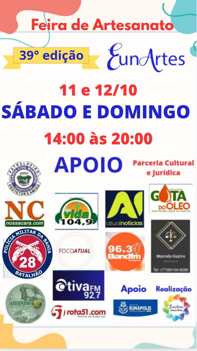 Gostaria de convidar você e sua família, para a ir nos prestigiar em nossa feira de Artesanato EunArtes ,que vai acontecer nos dias 11 E 12 de Outubro, SÁBADO E DOMINGO em novo *NOVO HORÁRIO: 14:00 às 20:00 hs, PRAÇA DA MATRIZ -CENTRO*, vamos ter bastante variedades de *Artesanatos, * e no setor *Gourmet* teremos bastante novidades, BARRACA DA HELENA CHURRASCO COM FAROFA.