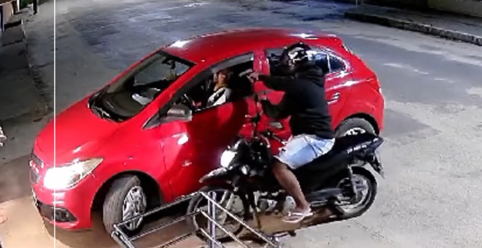 De repente, um assaltante em uma moto surgiu do nada, e saca uma pistola e aponta para a motorista, anunciando o roubo.
