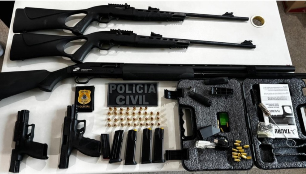 Durante o cumprimento da ordem judicial, os policiais civis localizaram e apreenderam uma pistola calibre 9 mm, uma pistola calibre .380, duas carabinas calibre .22 e uma espingarda semiautomática. Todo o material foi recolhido e encaminhado para perícia.
