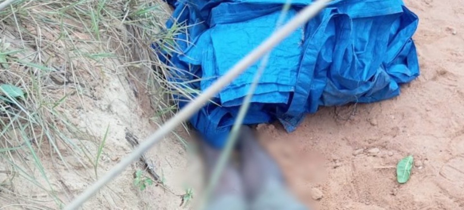 A presença de uma lona azul próxima ao corpo sugere que o cadáver possa ter sido deixado naquele local.