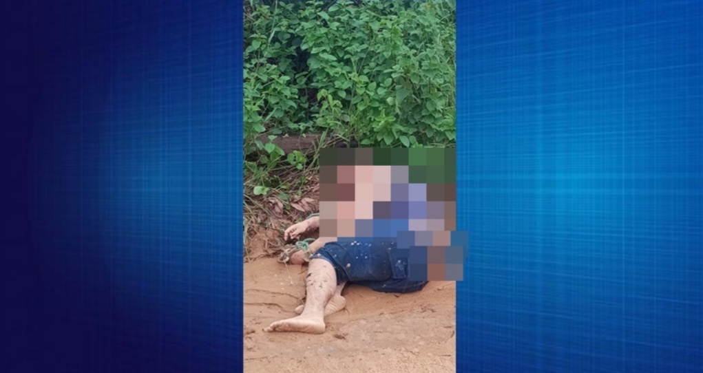 A vítima estava trajando bermuda jeans azul, camiseta cinza, com uma corda amarrando as mãos e ferimentos na cabeça.