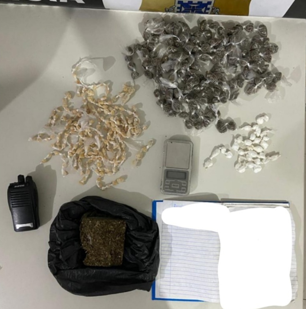 Na mochila os policiais encontraram; 224 pedras de crack, 150 buchas de maconha, 30 papelotes de cocaína, 01 pedaço grande de maconha pesando aproximadamente 181 gramas, 01 balança de precisão pequena, 01 rádio de transmissão e 01 caderno contendo anotações financeira da venda de drogas.