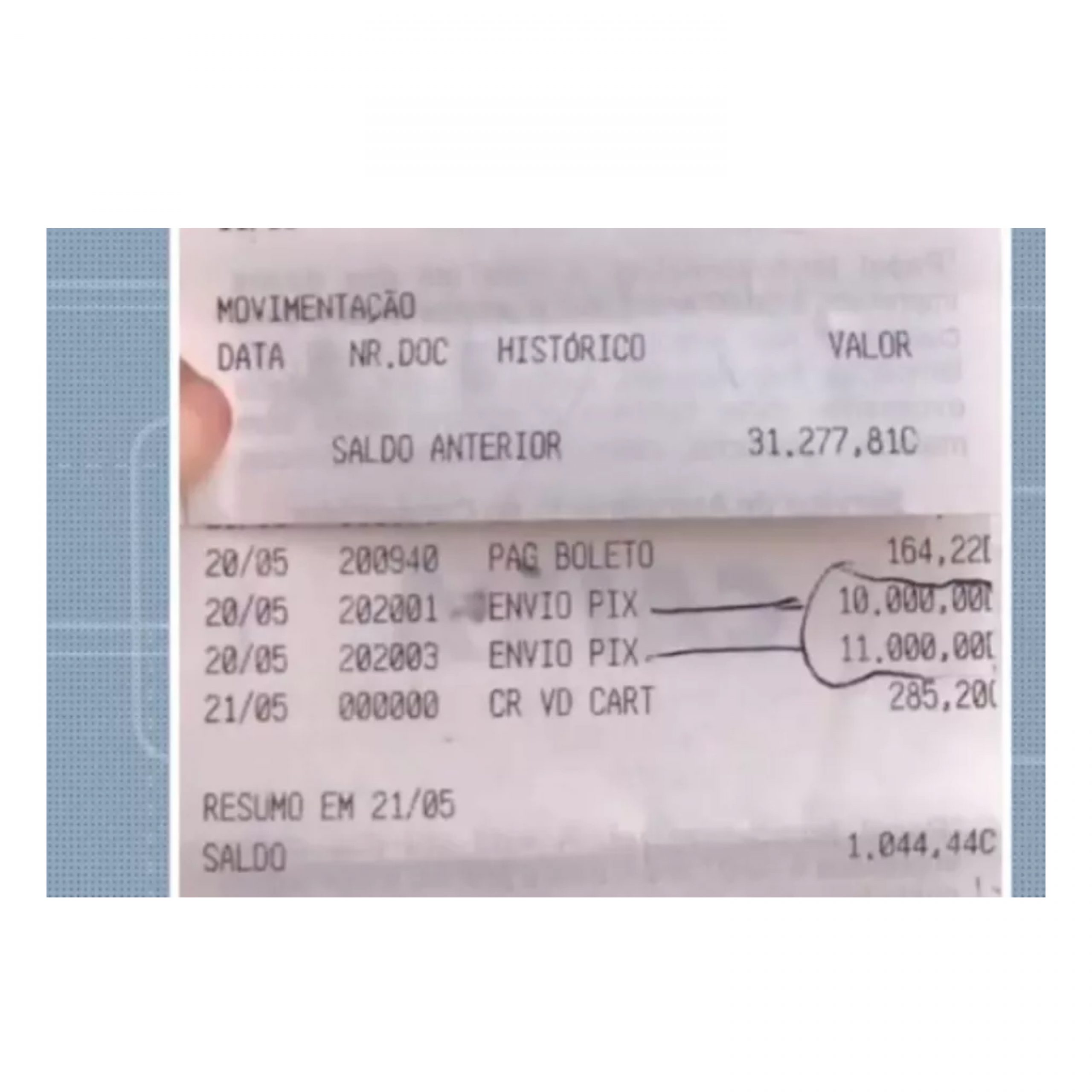 Os extratos das transações bancárias mostram que o primeiro PIX, no valor de R$ 10 mil, foi feito no dia (20/05), às 20h01, para Anderson Cardozo da Silva. Dois minutos depois, a segunda transferência retirou mais R$ 11 mil da conta de Ana Paula para outra conta, no nome de Mikael Murilo Rodrigues.