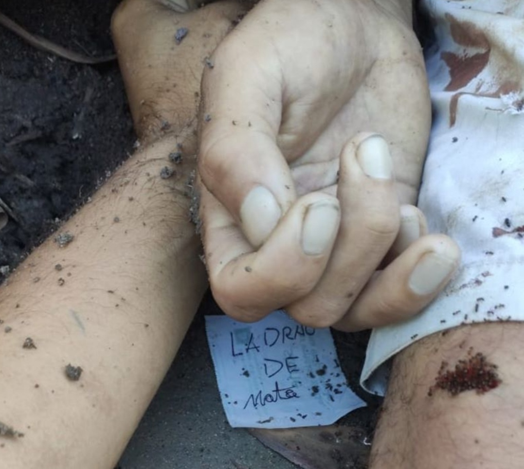 Próximo a mão esquerda da vítima os policiais encontraram um bilhete com a descrição “ladrão de moto”.