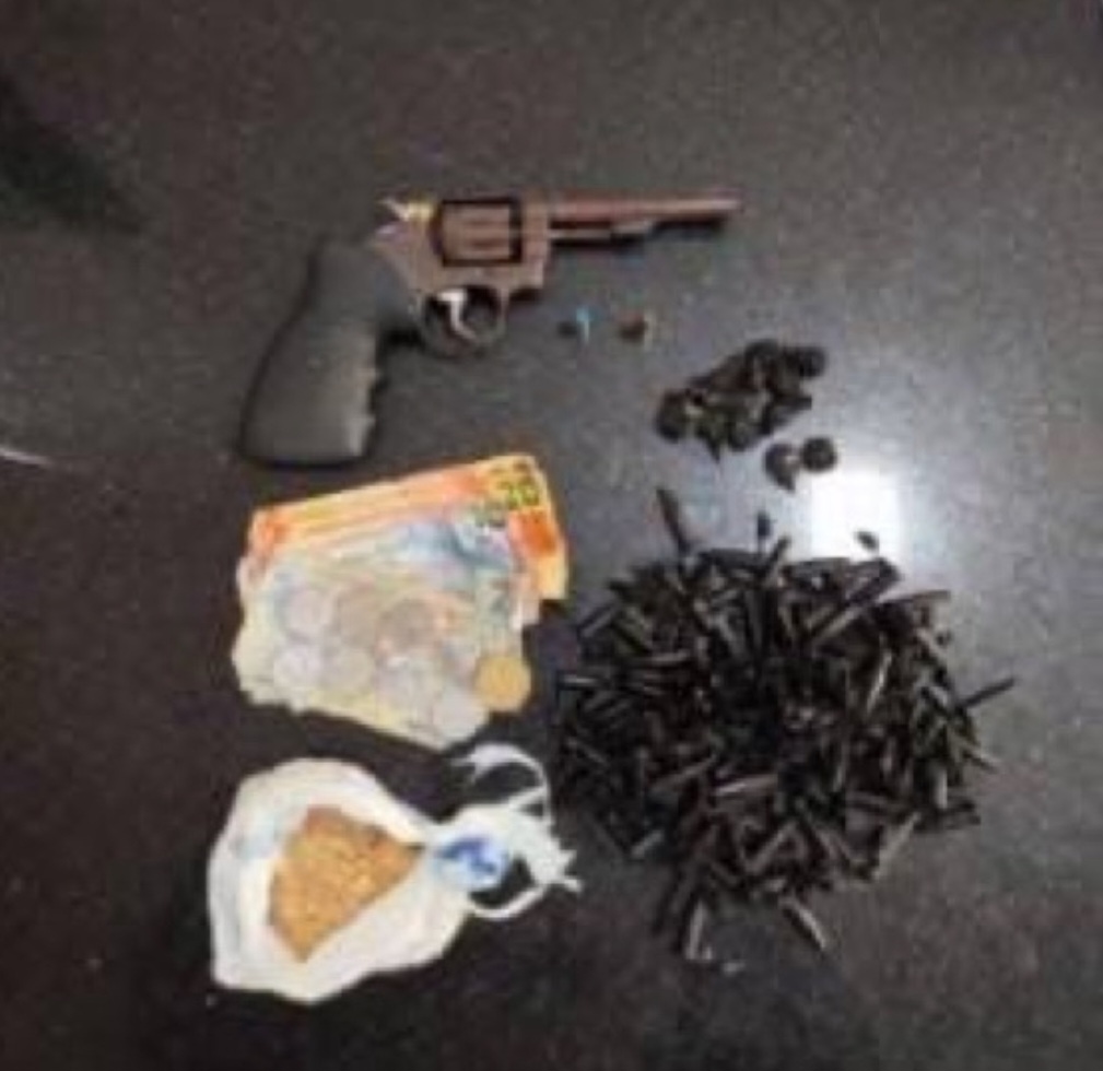 Durante a abordagem e busca pessoal, os policiais encontraram com o indivíduo um revólver calibre 32, duas munições, cerca de 80 gramas de uma substância semelhante a crack, 10 papelotes de cocaína e diversas embalagens utilizadas para o acondicionamento de drogas.