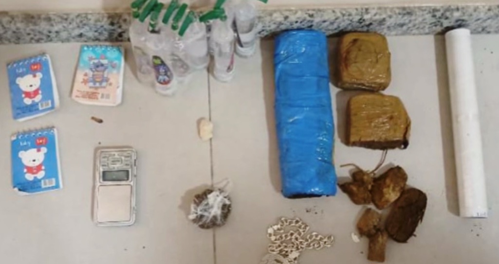 No total, foram apreendidos 941 gramas de maconha, 9 frascos de lança-perfume, 2 gramas de crack, além de uma balança de precisão, um rolo de papel filme usado para embalar drogas, cadernetas com anotações do tráfico e duas correntes prateadas.