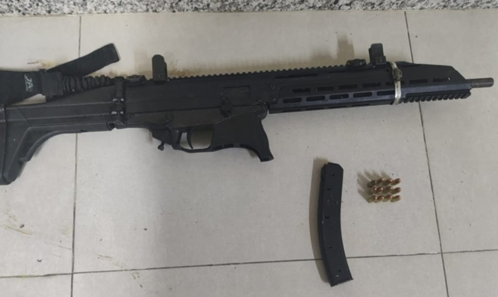 Houve uma troca de tiros e em seguida um dos suspeitos foi encontrado alvejado. O indivíduo estava com uma arma do tipo Carabina CT9, calibre 9 milímetros, totalmente municiada.