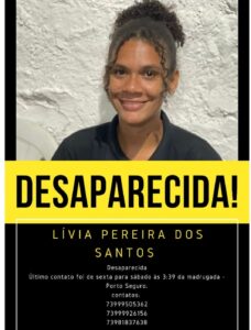 Desde a última sexta-feira 21 de marco, uma jovem identificada como Lívia Pereira dos Santos está desaparecida após sair do Projeto Maravilha, zona rural da cidade de Eunápolis-BA, com destino a Porto Seguro/Ba. Segundo informações registradas na delegacia, Lívia teria viajado para sacar o benefício do Bolsa Família na Caixa Econômica, mas desapareceu e não fez mais contato com a família desde então.