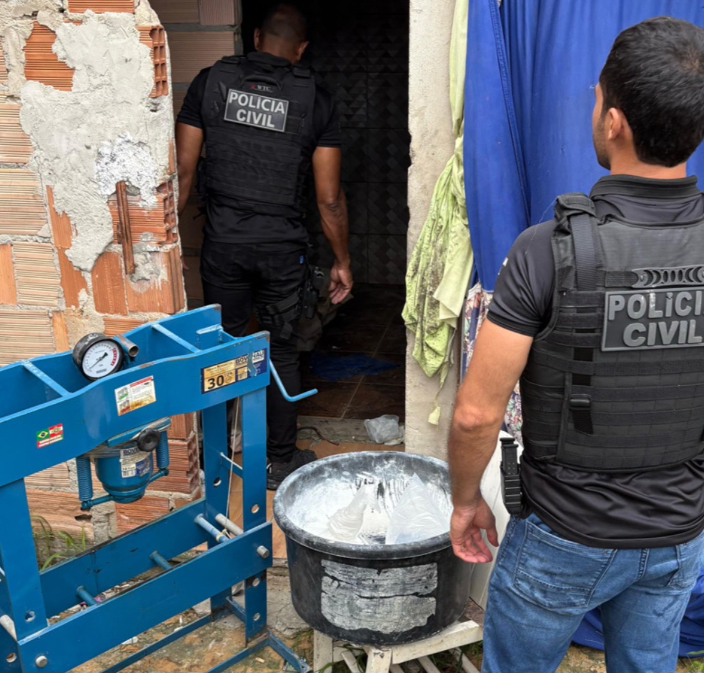 Durante as investigações, os policiais identificaram um imóvel utilizado para o processamento e embalagem de drogas. No local, foram encontrados 4,150 kg de cocaína, além de balanças de precisão, uma prensa hidráulica, facas, eppendorfs, fitas adesivas e sacos plásticos, materiais típicos da fabricação e acondicionamento de entorpecentes.