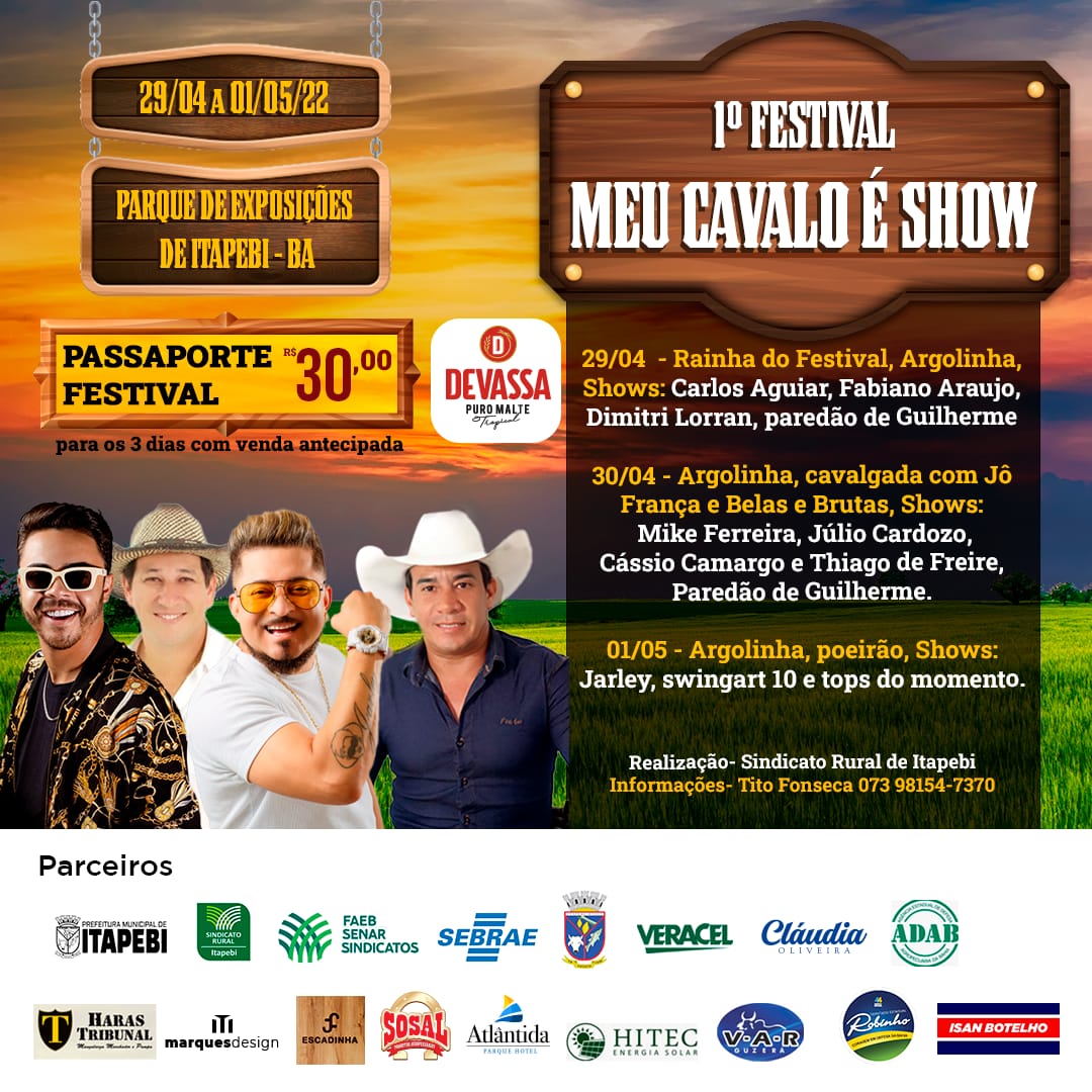 O Sindicato Rural de Itapebi/Ba, estará realizando de 29/04 a 01/05, o 1° Festival Meu Cavalo é Show, que inaugura uma nova fase do Parque de Exposições de Itapebi que ficou fechado por algum tempo, e passou por grande reforma.