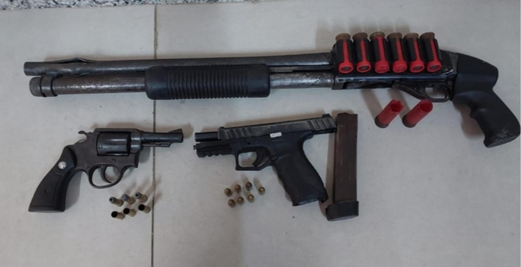 Na ação policial foram apreendidos; 01 Revólver cal.38, 01 escopetas cal. 12, 01 pistolas cal 9mm, 06 munições cal 12 intactas, 02 munições cal 12 deflagradas, 07 munições 9mm, 03 munições cal .38 intactas, 03 munições cal. 38 deflagradas e o veículo Fiat/Pálio.