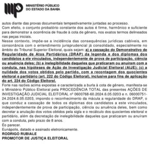O Ministério Público Eleitoral da Bahia pediu a cassação do mandato do vereador Josemar da Saúde e de toda a chapa proporcional do Democracia Cristã (DC) eleita em Eunápolis nas eleições de 2024. O pedido consta em parecer apresentado nesta quarta-feira 04 de fevereiro de 2026 no âmbito de uma Ação de Investigação Judicial Eleitoral (AIJE) que tramita na 203ª Zona Eleitoral.