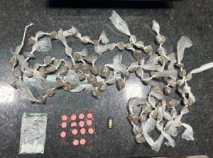 Entre os itens apreendidos estão 14 comprimidos de substância análoga ao ecstasy, 84 buchas de maconha (totalizando cerca de 85 gramas), uma porção de cocaína com aproximadamente 1 grama, uma munição calibre 9mm intacta e um aparelho celular.