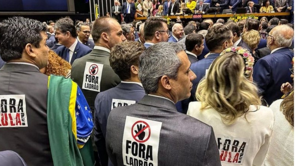 Os parlamentares do partido do ex-mandatário Jair Bolsonaro chegaram a colocar cartazes nas costas com frases como “Fora Lula” e “Fora Ladrão”. Eles ainda colocaram fitas na boca.