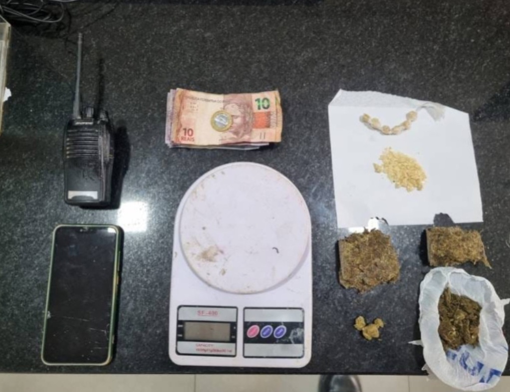 Durante a ação, os policiais encontraram um rádio comunicador, uma balança de precisão e aproximadamente 77 gramas de substância análoga à maconha.