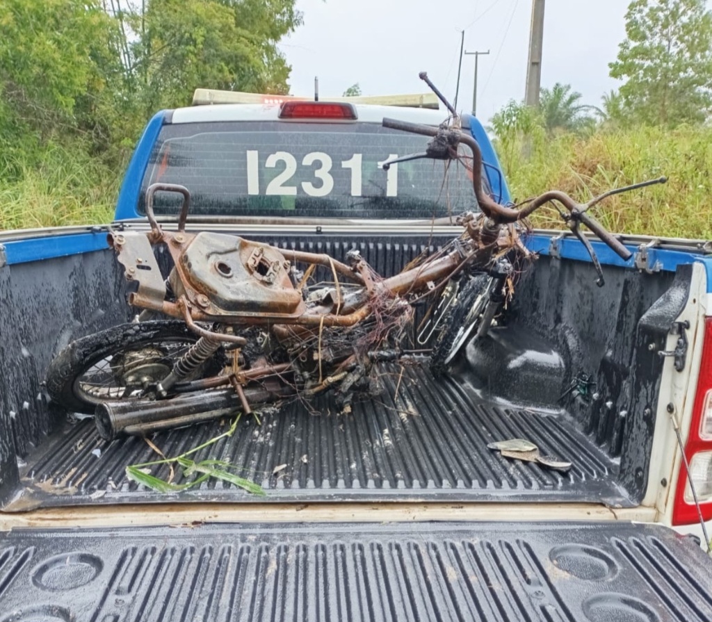 Além da motocicleta, os policiais também localizaram um aparelho celular completamente queimado nas imediações.