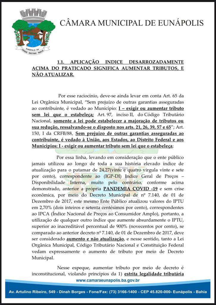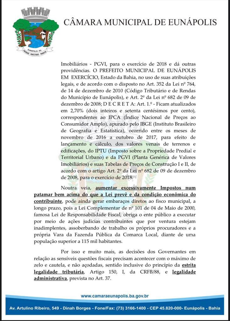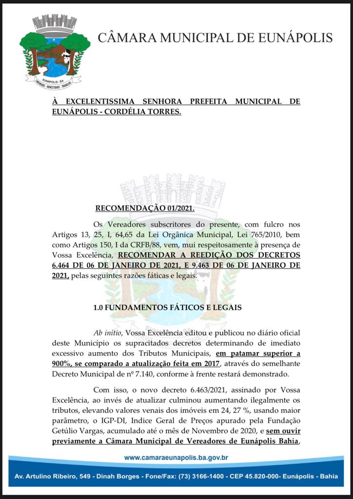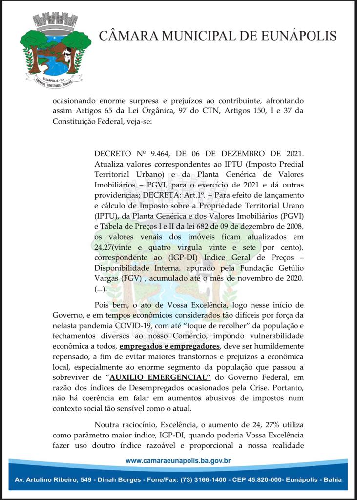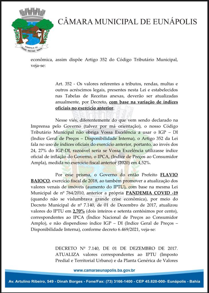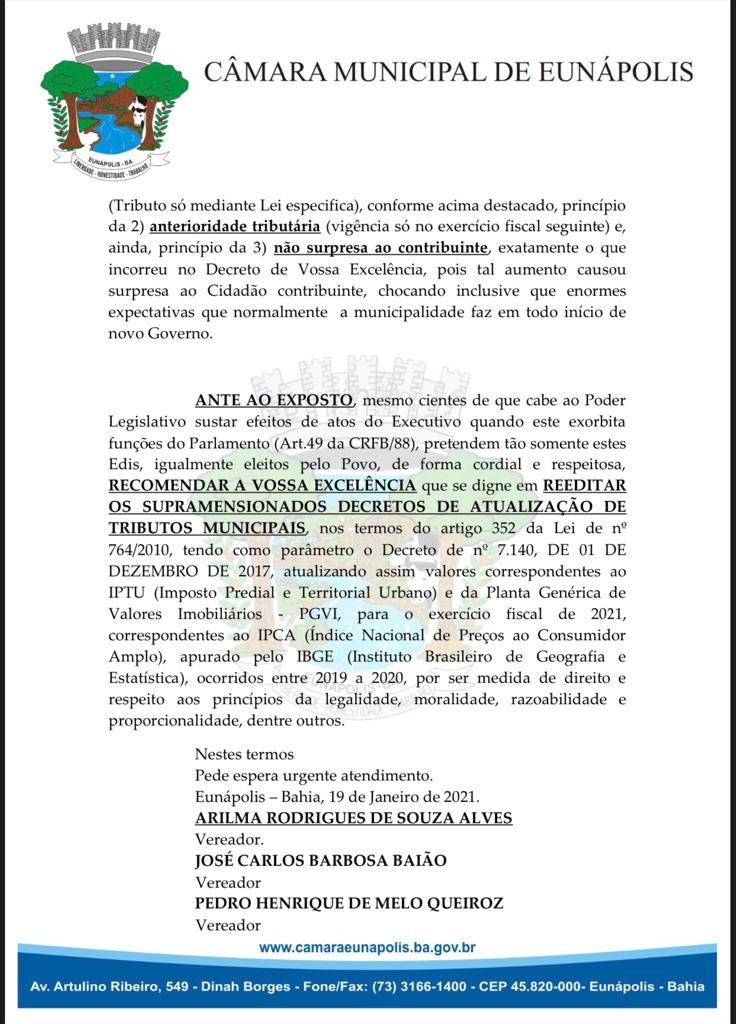 Em Eunápolis, a maioria dos vereadores da câmara municipal assinaram uma indicação ao Executivo Municipal, e requisita que reedite Decretos de número 6464/2021 e 9463, que renovou índices de adequação dos impostos municipais em mais de 24%.