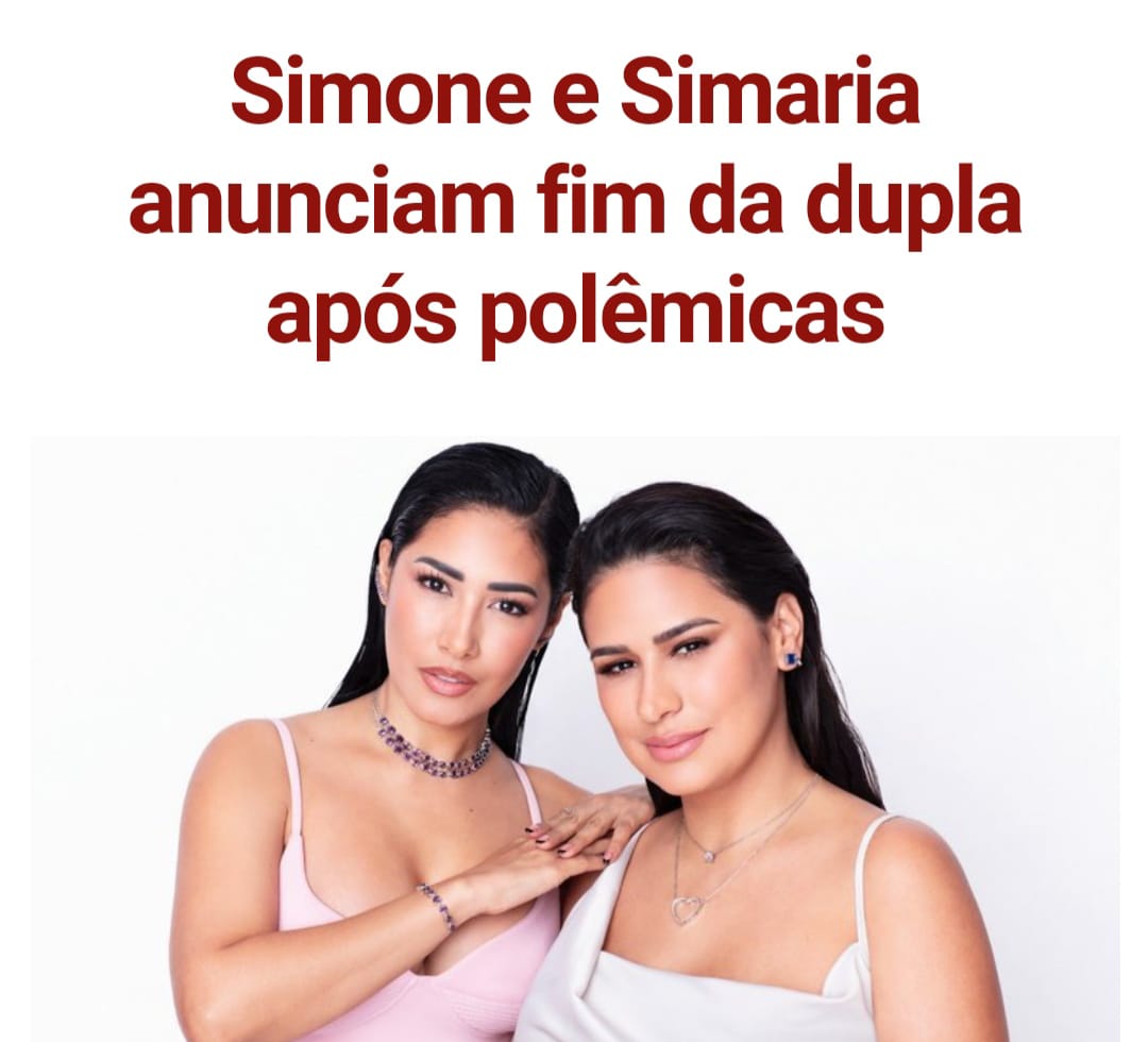 Na noite desta quinta-feira 18 de agosto, as cantoras Simone e Simaria divulgaram uma nota anunciando o fim da dupla após diversas polêmicas, como as que resultaram no afastamento de Simaria dos palcos por tempo indeterminado, ocorrido em junho.