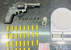 Durante a ação, os policiais apreenderam um revólver calibre .38 com seis munições deflagradas, 30 pinos de cocaína, 69 pedras de crack, um celular, uma balança de precisão e R$ 10 em dinheiro.