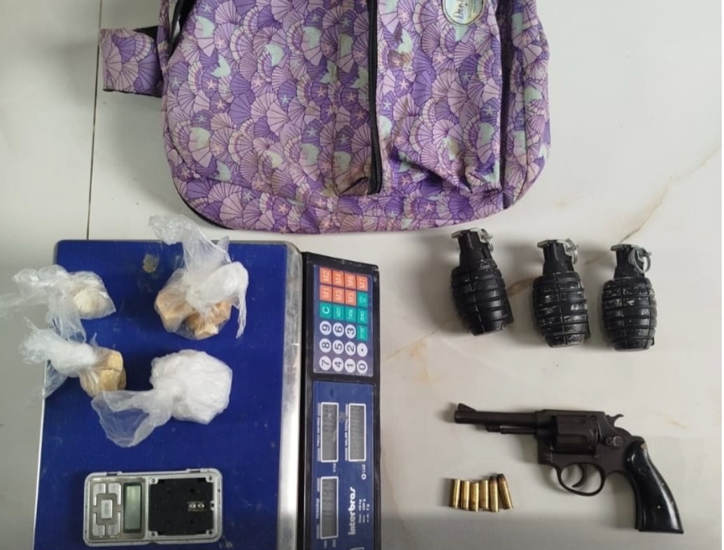 O material apreendido foi apresentado na delegacia do município para as devidas providências. Entre os itens recolhidos estavam um revólver calibre .38, munições, três granadas, uma balança de precisão, além de 90g de crack e 60g de cocaína.