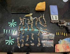 Segundo a polícia, foram apreendidos um revólver calibre .32 com numeração suprimida, munições, 64 buchas de maconha, porções de crack que somam cerca de 253 gramas, 19 pinos de cocaína, porções de haxixe, uma balança de precisão, um aparelho celular e R$ 15 em espécie.