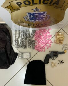 Gustavo já possuía um mandado de prisão por homicídio. Com ele foram encontrados um revólver calibre .38, munições, drogas (cocaína, maconha e crack), uma balança de precisão, uma quantia em dinheiro e uma balaclava.