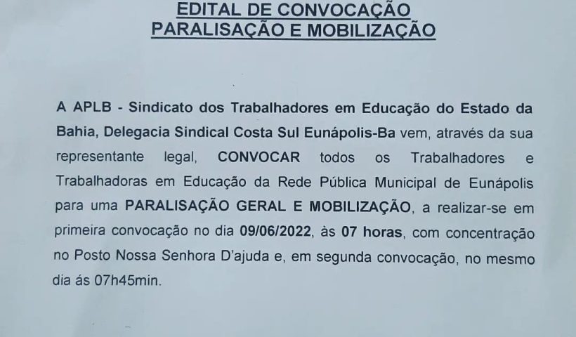 A APLB Sindicato dos Trabalhadores em Educação do Estado da Bahia, Delegacia Sindical Costa Sul Eunápolis-Ba vem, através da sua representante legal, CONVOCAR todos os…