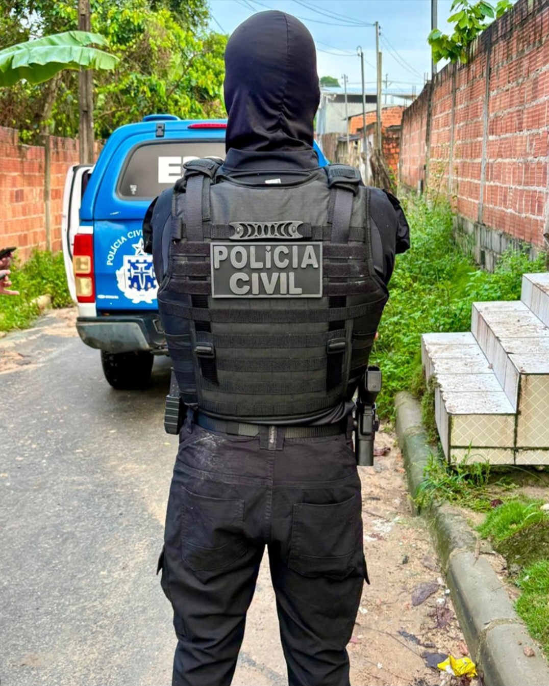 Com o criminoso foi apreendida uma arma de fogo, colete balístico, drogas, anotações e aparelhos celulares.