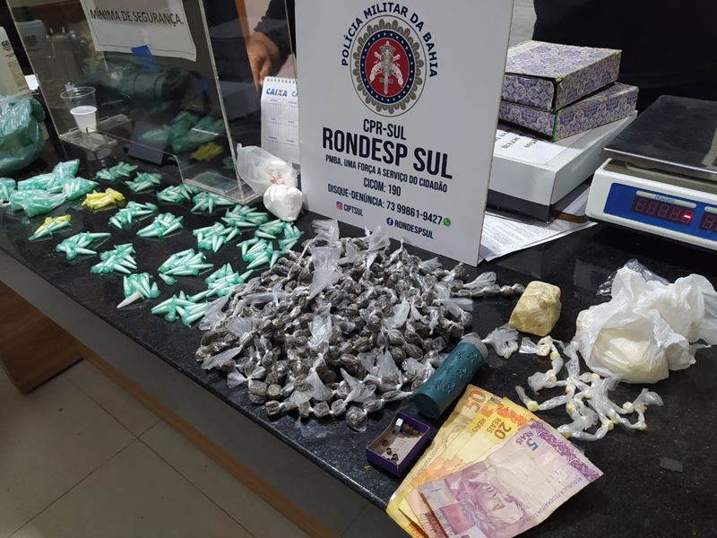 Na noite de segunda-feira (15/03), por volta das 23:00 horas, na cidade de Eunápolis, bairro Juca Rosa, a equipe da RONDESP-SUL apreendeu 25 pedras de crack, 397 buchas de maconha, 276 pinos de cocaína, 45 gramas de pólvora, 06 espoletas e R$ 107,00 reais em espécie.